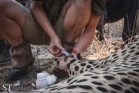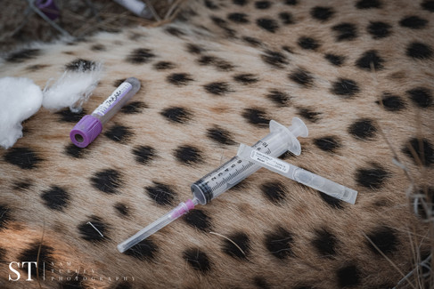 As the Cheetahs settled into their new environment they began to put on weight. This meant that the GPS collars around their neck was beginning to become too tight. The veterinary team therefore darted them and loosened the collars. Whilst they were sedated, it was a good opportunity to check their overall health including taking blood samples, checking their paws for general wear and their teeth/gums.